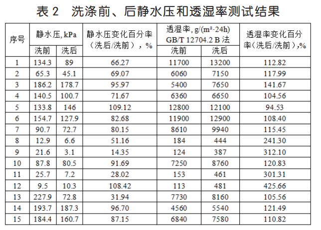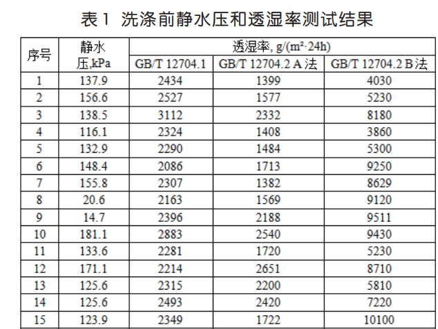 以筆者所在的檢測機構(gòu)為例,收集了一定時間內(nèi)的沖鋒衣面料檢測樣品,共計 50 個,其中 35 個樣品采用上述方法,進行靜水壓和透濕率測試,研究不同方法之間的關(guān)系,結(jié)果見表 1。15 個樣品按照GB/T 32614-2016《戶外運動服裝 沖鋒衣》測試比較樣品洗滌前、后的靜水壓和透濕率變化,結(jié)果見表 2。