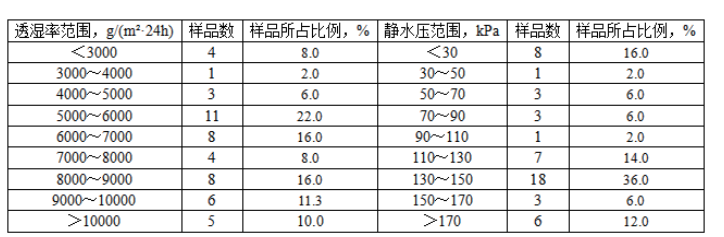 3.1 透濕率、靜水壓測試結(jié)果分布