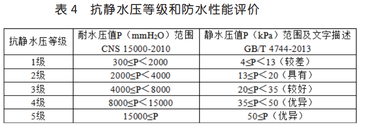 可見,防水透濕面料倒杯 - 蒸發(fā)法的透濕率基本符合正態(tài)分布,≤ 4000g/(m2·24h)的比例為10.0%,> 10000g/(m2·24h)的比例 10.0%,一半以上測試結(jié)果集中在 5000~ 9000 g/(m2·24h)。而靜水壓測試結(jié)果相對比較分散,≤ 30kPa 的比例為 16.0%,> 170kPa 的比例為 12.0%,70% 以上的測試結(jié)果大于 70kPa。以 GB/T 32614-2016《戶外運動服裝 沖鋒衣》中對沖鋒衣面料 I 級功能性要求而言,即洗滌前透濕率≥ 5000g/(m2·24h),靜 水 壓 ≥ 50kPa,50 塊 面 料 透 濕 率 合 格 率 為84.0%,靜水壓合格率為 82.0%,合格率基本一致。但靜水壓指標(biāo)相對更好,三分之二的樣品靜水壓> 100kPa,遠遠滿足標(biāo)準(zhǔn)要求,這也驗證了靜水壓指標(biāo)通過在織物表面的涂層處理很容易符合標(biāo)準(zhǔn)要求。將 GB/T 4744-2013《紡織品 防水性能的檢測和評價 靜水壓法》及臺灣標(biāo)準(zhǔn) CNS 15000-2010《防水透濕紡織品性能評估》[8] 對靜水壓的評價性能列如表 4 所示。
