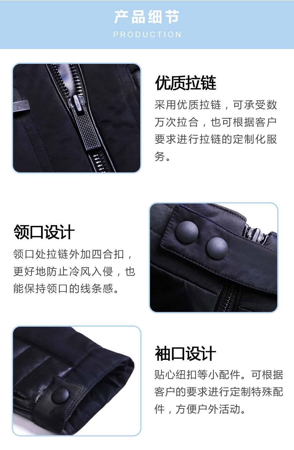 領口設計:領口處拉鏈外加四合扣,更好地防止冷風入侵,也能保持領口的線條感。