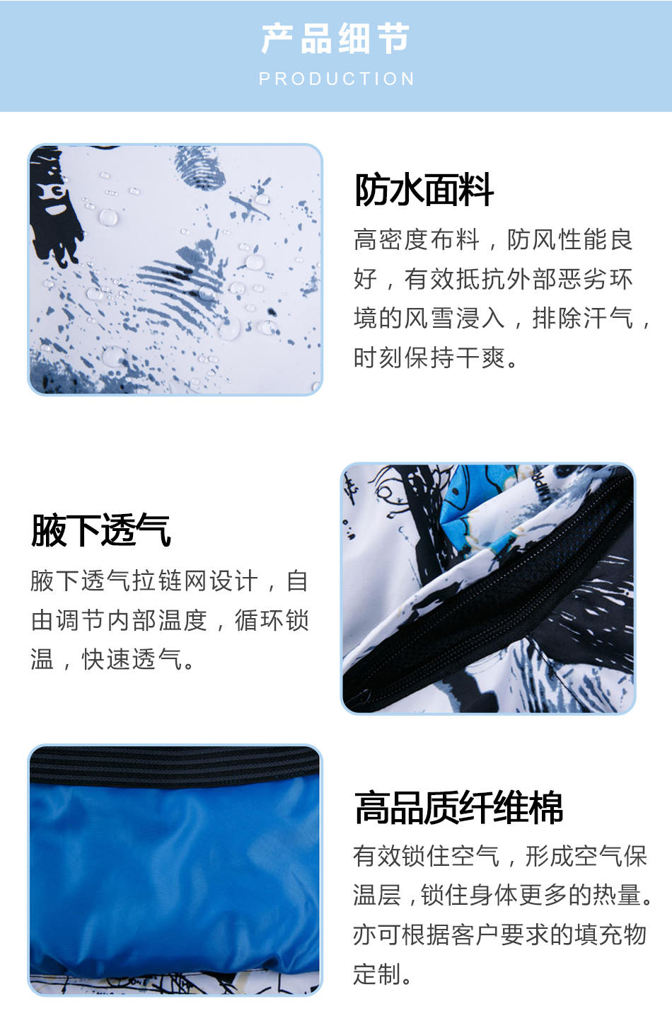 高品質(zhì)纖維棉:有效鎖住空氣,形成空氣保溫層,鎖住身體更多的熱量。亦可根據(jù)客戶要求的填充物進(jìn)行保暖滑雪服定制。